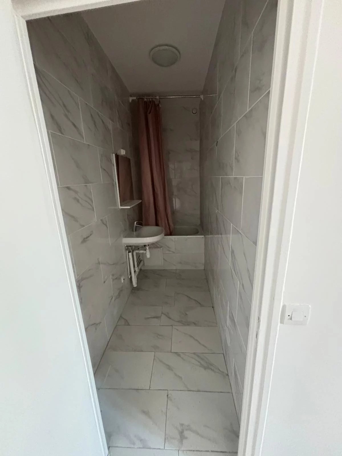 Une entrée ouvrant sur un séjour avec cuisine ouverte, une chambre avec sa salle de bains attenante, ainsi qu’un WC séparé.